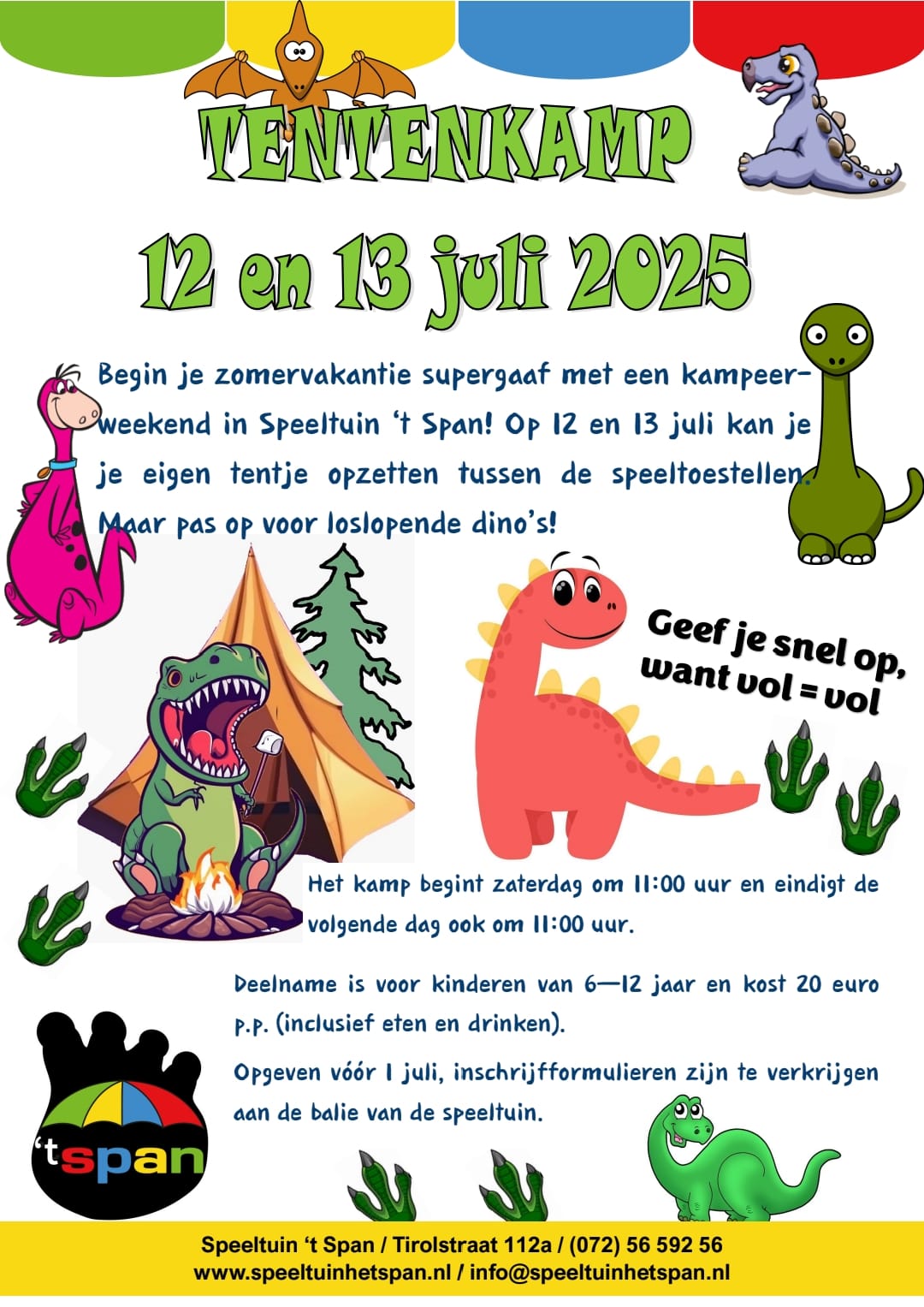 Speeltuin ’t Span is tijdens het speelseizoen van maandag tot en met zondag geopend van 10:00 tot 17:00. Bij slecht weer, groot onderhoud of personele omstandigheden kan hiervan worden afgeweken. Voorkom teleurstelling en bel bij twijfel naar ’t Span: (072) 56 192 56. Mocht speeltuin ’t Span onverwacht dicht zijn, dan zal dit via de website en/of Facebook worden aangekondigd.